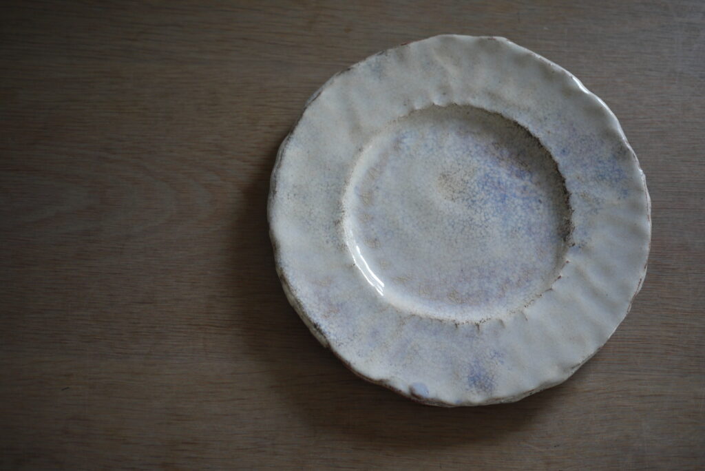 これは四海大さんの板皿。四海さんは、栃木県の益子で活動し、おもに北関東の原土を自分で精製し作品をつくる。近年、土地ごと、地形ごとに異なる土本来の個性、それもひと筋縄ではうまく扱えない土の特性にまで魅せられて焼物をする作家が出てきていて、個展にうかがえば、同じ人が作ったものなの?と疑うほど、あらあらしかったり、やさしかったり、さまざまなテクスチャー、重さ、色の作品が並ぶことも。それぞれの作品に土のストーリーがあるのが面白い。受け取る私は、そうした話をもとに土と格闘する作り手の姿を想像することで、うつわをこれまで以上に楽しめる。この板皿は、軽石のような密度の土を使っているという説明だった。辞書のように小脇に抱えてみると、重心があるようでないような不思議な密度感。表面の釉薬の流れも見応えがある。握り飯がしっくり合うことに気づき、毎朝使うようになった。なかなか起きない次男が短時間で食べやすいようにと、やることは他にもあるのに、つい握ってあげちゃう母の機嫌をとってくれるうつわでもある。サンキュー。