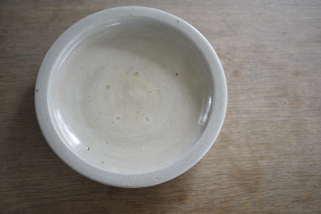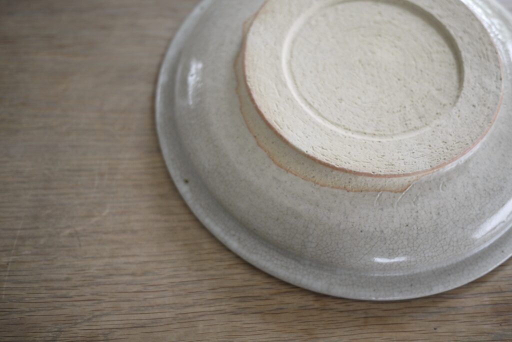 This is ISHIZARA by Takuji Hayashi. ISHIZARA is a thick, large Seto ware dishes primarily produced in Seto, Aichi Prefecture, and were commonly used at home during the Edo period. Their wide serving surface and rim make them particularly attractive to tableware enthusiasts, as they present food beautifully. Vintage pieces, whose character deepens with age, are naturally splendid, but their substantial weight means they can only placed at the centre of the table. As an artist from Seto, Hayashi references locally passed-down forms while creating pieces that are standard in both size and weight today, suited both for home party and everyday single-plate meals. The beige hue, achieved by soaking in chestnut tannin to colour the crackle glaze, beautifully complements a wide array of ingredients. It is also fantastic to place candles to decorate windows.