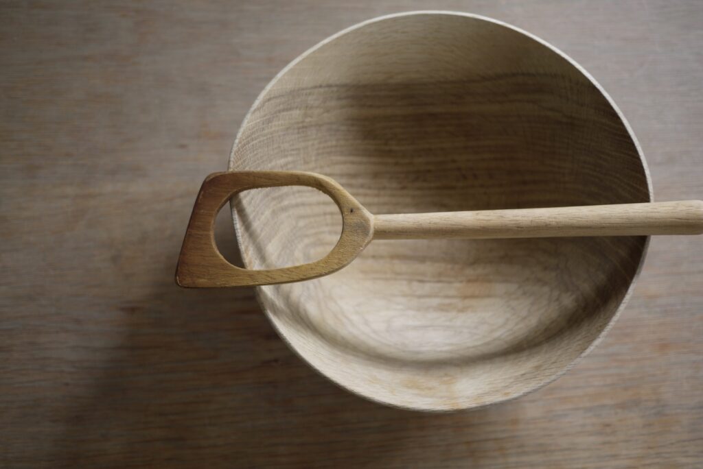 これは瀬川辰馬さんのリムプレート。クラックのあるリッチなテクスチャーにひかれ、初めて手に取った時に強く感じたのは、むしろ指先に吸いつくような触り心地のよさだった。リムに手をかけた時に感じるカーブが気持ちよく、裏までまじまじと観察したほどだ。表現の面白さを使いやすさへとつなげているそのカーブは、型成形という技法からうまれる。石膏型に粘土を押し当てかたちづくる方法で、瞬発力を要するろくろ成形よりも、じっくり時間をかけてフォルムを追求することができると聞く。一度型が決まれば、量産できると同時に、釉掛けや焼成の工夫でひとつひとつ異なる表情も生み出せる。このゴールドは、銀彩にクラックが入るように瀬川さんが独自にアレンジした「シン・硫化銀彩」シリーズ。もっと大きなクラックのある「硫化銀彩」の同型を翌年に買い足したので、並べて使う楽しみが増えた。瀬川さんの作り方ではそれが叶う。いろいろなオケージョンに映える落ち着いたゴールドも気に入っている。クリスマスディナーには間違いなく合うのだけれど、ディナーの翌朝、遅く起きて寝ぼけつつフレンチトーストにしたら、そういうカジュアルダウンもいい感じ。